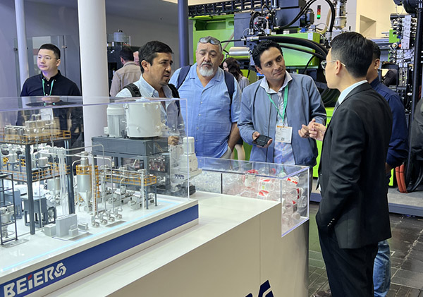 貝爾機械全景展示了塑料回收全鏈條技術:從廢棄塑料清洗、造粒到再生料高值化利用的完整產線,視頻演示如何將塑料廢棄物轉化為高純度再生粒料。我們搭建的智能生產管理平臺,接入客戶的設備終端,通過AI算法實時監控各工藝參數,將設備故障預警響應時間壓縮至秒級。針對海外客戶痛點,我們聯合多家國際服務商建立快速響應網絡,這一方案完美契合 K 展 “智能循環經濟” 核心議題,可幫助企業實現碳減排與資源高效循環的雙重目標。