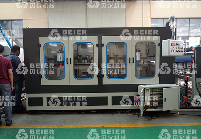 2. PVC層由SJZ80/156錐形雙螺桿擠出機(jī)生產(chǎn),ASA或者PMMA層由SJ50單螺桿共擠機(jī)擠出,設(shè)備還有T型模具,成型機(jī),切割機(jī)和堆放架組成